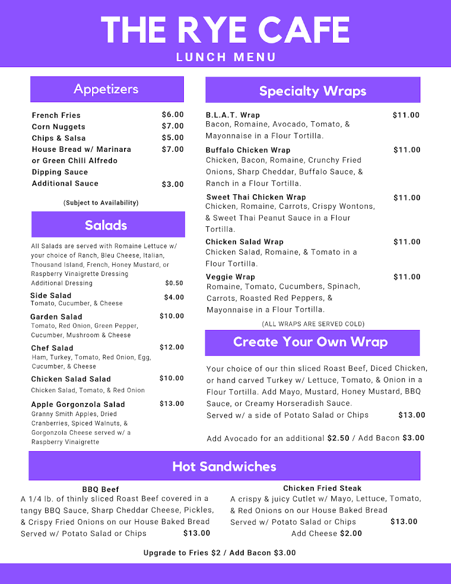 Romaine, Tomato, Red Onion, & your choice of Diced Chicken, Turkey, or Roast Beef in a Flour Tortilla Choose from Mayo, Mustard, BBQ, Creamy Horseradish, & Honey Mustard Add Avocado $2.50 Add Bacon $3